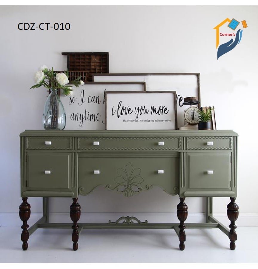 Made of solid Mahogany wood leg with leg base lacquer polish and Canadian Oak Veneer MDF Board on cabinet with matte sage green duco paint finish.