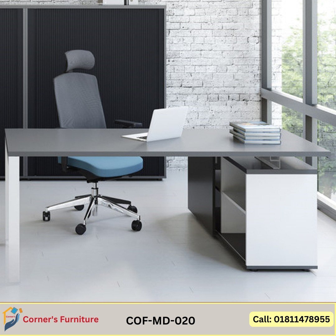 Leg and structure is made of heat painted MS and the top is made of Canadian OAK Veneer MDF with Docu paint / Melamine coated chip board in two color as per picture. The side storage unit is 3′ in length.